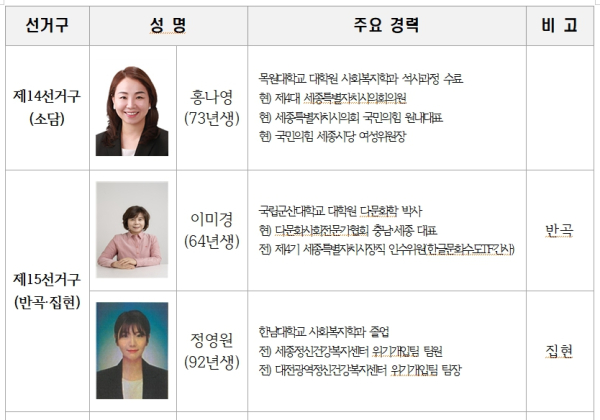 제15선거구(반곡·집현): 향후 선거구 분리를 대비해 이미경 후보(반곡동)와 정영원 후보(집현·합강·용호동)를 각각 내정했다. 다문화 전문가인 이미경 후보는 공동체 통합을, 사회복지 및 정신건강 전문가이자 청년 인재인 정영원 후보는 복지 사각지대 해소와 청년 정책 추진을 책임질 적임자로 평가됐다.