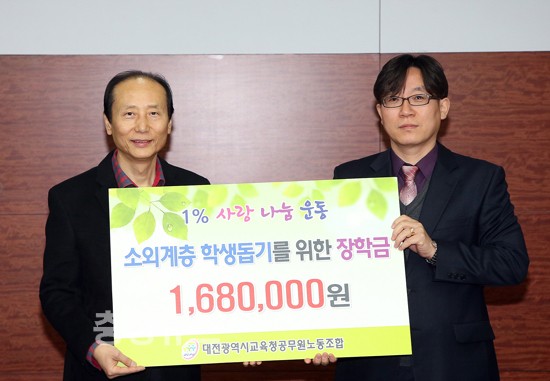 대전광역시교육청공무원노동조합(위원장 이상진, 이하 “대전교육청노조”)은 14일 대전광역시교육청(교육감 김신호)에 ‘소외계층 학생 돕기를 위한 성금’ 168만원을 전달했다고 밝혔다.