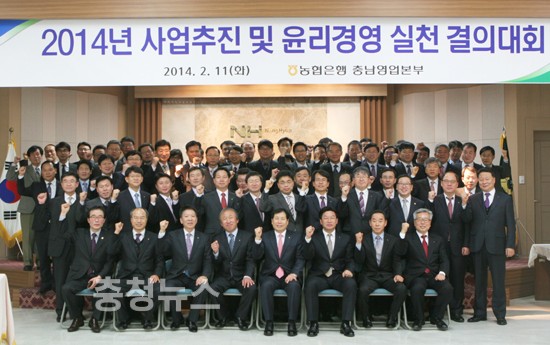 NH농협은행 충남영업본부(본부장 윤동기)는 11일 영업본부 회의실에서 충남관내 시·군지부장, 지점장, 출장소장 등 사무소장 80여명이 참석한 가운데 '2014년도 사업추진 및 윤리경영 실천 결의대회'를 개최했다.