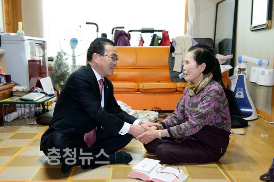 ▲ 유한식<사진 좌측> 세종시장이 3·1절을 앞두고 26일 오후 1시 30분 조치원읍에 사는 독립유공자 고 곽창영 옹의 외손자녀 임점순(82·여) 유족을 위문하는 모습.