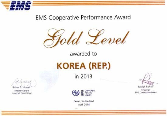 충청지방우정청(청장 김영수)에 따르면 스위스 베른에서 열린 UPU 연차회의에서 한국의 우체국 국제특송 EMS가 2013년 서비스 품질 평가 결과, 영예의 최고상인 금상(Gold Level)을 수상했다고 3일 밝혔다.