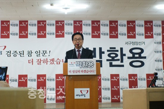박환용 청장은 이날 새누리당 대전시당 3층 강당에서 기자회견을 열고 “4년 전 다짐과 각오를 되새기며 서구민 앞에 다시 섰다”며 “세계에서 가장 행복한 도시 서구의 꿈을 중단 없이 이루어 더 큰 도약을 위해 재선에 도전한다”고 출사표를 던졌다.