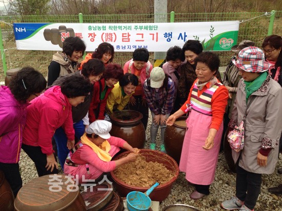 농협 충남지역본부(본부장 김병문)는 11일 충남 서천 장수마을에서 우리 전통음식인 장(醬)의 소중함과 착한 먹거리의 중요성을 알리고자 ‘착한 먹거리 주부체험단 전통 장(醬) 담그기’ 행사를 개최했다.