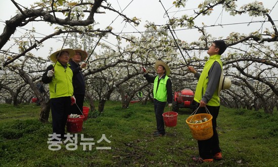 충남농협은 16일 인력 집중화 가중으로 어려움을 겪고 있는 과수농가를 찾아 배 화접 봉사를 실시했다.