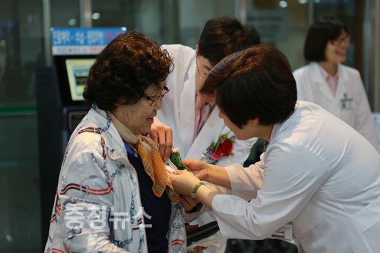 충남대학교병원(병원장 김봉옥)은 8일 어버이날을 맞아 주요 보직자들이 직접 카네이션을 달아주는 행사를 가졌다.