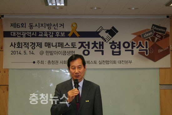 이 후보는 이날 오후 2시 탄방동 ‘아이쿱 한밭생협’ 회의실에서 열린 ‘사회적경제 매니페스토 정책협약식’에 참석해 서명한 뒤, 교육감 당선 시 ‘사회적기업 제품의 우선적 구매’와 ‘양서협동조합 설립을 통한 도서관 활성화’를 반드시 추진하겠다고 밝혔다.
