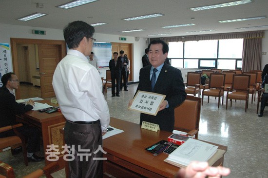 김지철 충남교육감 후보가 15일 충남선관위에 가장 먼저 후보 등록을 했다.