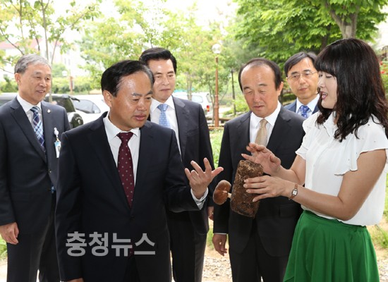 ▲ 전찬환 교육감 권한대행이 특수학급 학생들이 버섯재배 체험실에서 재배한 버섯을 살펴보고 있다.