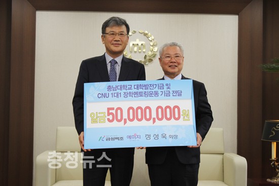 (주)금성백조주택 정성욱 회장이 26일 충남대학교 정상철 총장을 방문해 대학발전기금 및 CNU 1대1 장학멘토링 운동 기금 5,000만 원을 전달했다.