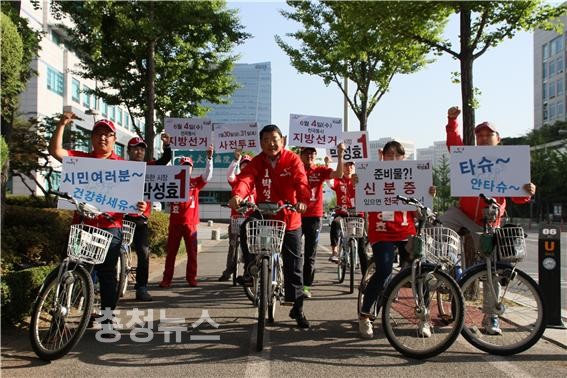 새누리당 박성효 대전시장 후보는 30일 캠프 자전거 홍보단인 ‘타슈 유세단’과 함께 ‘사전투표’ 홍보에 나섰다.