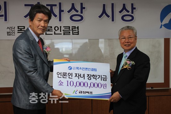 이날 전달식은 12일 오전 목요언론에서 진행된 6월 정기월례회에서 지역 대표 건설사 금성백조주택의 정성욱 회장이 목요언론인클럽 송화순 회장을 찾아 언론인클럽 자녀들의 장학금으로 쓰일 1천만 원을 기탁했다.