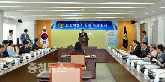 충남도의회(의장 김기영)는 15일 2014년도 의정자문위원회 전체회의를 개최하고 그동안 운영성과와 ‘14년도 운영계획을 청취했다. 이와 함께 제10대 의회가 중점적으로 추진해야 할 과제 등 2건에 대한 열띤 토론을 펼치고 곧 이어서 분과위원회를 개최했다.