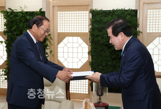 ▲ 김지철 충남교육감이 최청송 위원장에게 청렴옴부즈만 위촉장을 전달하고 있다.
