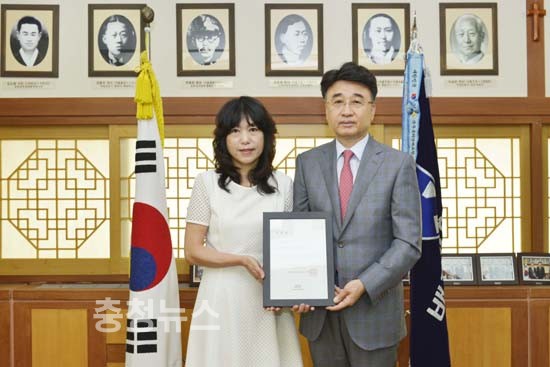 배재대학교 김영호 총장이 21일 총장실에서 1943년 배재학당을 졸업한 故인치덕 동문(통합 58회)의 딸인 인혜숙씨(대학원 최고경영자과정 34기)로부터 아버지의 유품인 졸업앨범을 기증받아 배재학당역사박물관에 소장했다.
