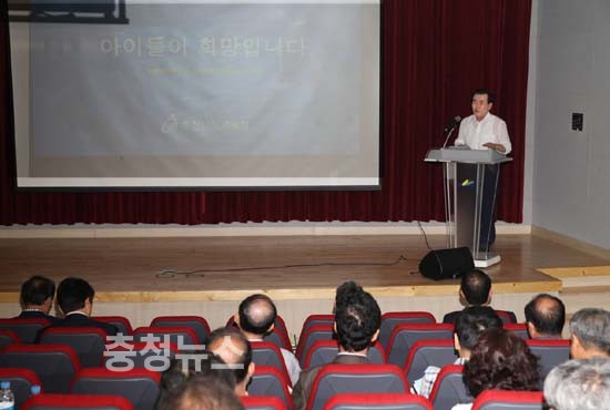 ▲ 김지철 교육감이 일반계고 학교장 연수에서 “아이들이 희망입니다.”고 역설하고 있다.