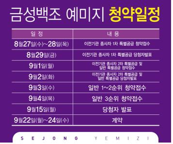 세종예미지는 세종시 이전 중앙부처 및 정부출연기관 직원에게 50%를 특별분양하고, 나머지 50%는 일반에 분양한다. 또 청약우선권이 주어지는 당해지역의 거주요건은 입주자모집공고일로부터 2년 이상 거주해야 가능하다. (☏분양문의:1899-2006)