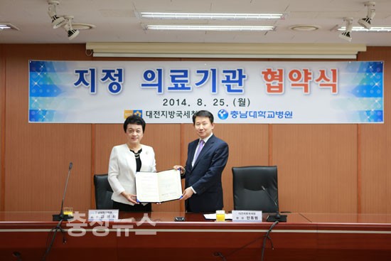 충남대학교병원(병원장 김봉옥)은 25일 대전지방국세청 2층 소회의실에서 대전지방국세청(청장 안동범)과 의료기관 지정 협약식을 체결했다.