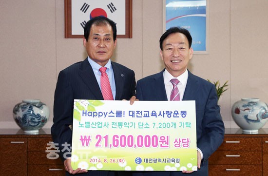 대전시교육청(교육감 설동호)은 26일 교육감실에서 대구 소재 노벨산업사(대표 노진모)로부터 전통악기 단소를 기탁 받고 감사패를 전달했다고 밝혔다.