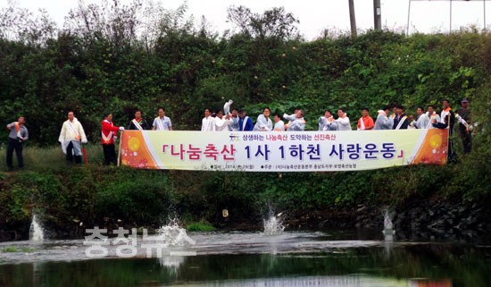 하천부지 환경정리를 통해 축산업이 환경오염 산업이라는 부정적인 이미지 개선을 위해 마련된 이번 행사에서는‘나눔축산운동 충남도지부’가 수질정화를 위해 유용 미생물인 EM 흙공을 하천에 투하했다.