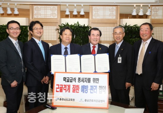 충남도교육청(교육감 김지철)은 22일, 도교육청 접견실에서 충남근로자건강센터(센터장 김용배)와 도내 학교급식 종사자들의 건강증진을 위해 ‘근골격계 질환 예방 및 관리 업무 협약’을 체결했다.