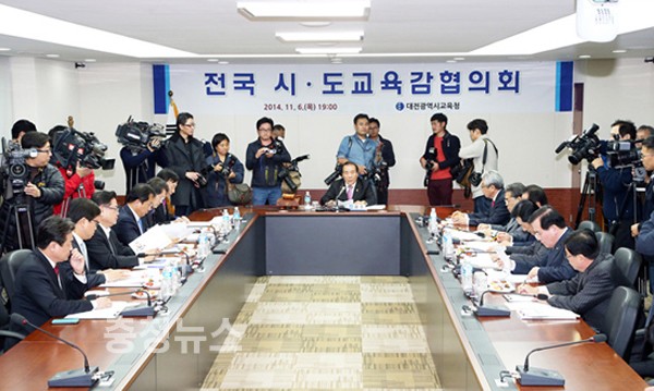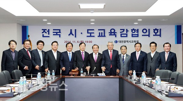 전국시․도 교육감 협의회는 6일 오후 7시30분 대전시교육청 중회의실에서 설동호 대전광역시교육감이 참석한 가운데 열린회의에서 무상급식 예산 지원 중단 사태와 누리과정 등 교육복지를 국가 예산으로 시행할 것을 촉구했다.