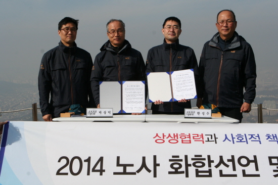 대전도시철도공사 노사가 ‘2014 노사화합선언’을 하고 노사평화로 지역사회발전과 회사 발전에 이바지 하자고 다짐했다. 공사는 11일 박상덕 사장을 비롯한 사용자측 간부들과 노동조합 한성수 위원장을 비롯한 조합원 등 30여명이 식장산 인근에서 환경정화 활동 후 ‘2014년 노사화합선언’을 했다.