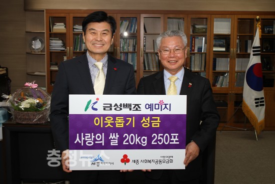 (주)금성백조주택 정성욱 회장이 12월 5일, 오후4시, 세종시를 찾아 이춘희 세종시장에게 사랑의 쌀 250포(1포/20kg, 1,125만원 상당)를 전달하였다.
