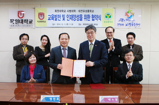 목원대(총장 박노권)는 11일 오전 본부 회의실에서 유성중학교(교장 정진호)와 협약식을 가졌다. 이번 협약식에는 박노권 총장과 정진호 교장을 비롯한 양 대학 관계자들이 참석하였으며 앞으로 진로체험프로그램 협조, 멘토링 교육 지원, 교육 및 학술 연구를 위한 인적 교류 등 상호간에 적극 협력하기로 체결했다.