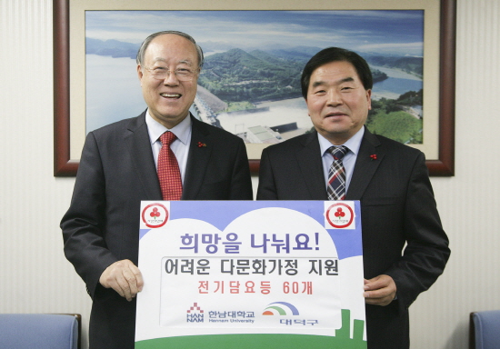 대전 대덕구는 15일 오후 구청 구민의 사랑방에서 박수범 대덕구청장 및 김형태 한남대학교총장을 비롯한 관계자가 참석한 가운데 다문화가정 세대의 따뜻한 겨울을 보낼 수 있도록 이불과 전기담요 60개를 기탁하는 전달식을 가졌다.
