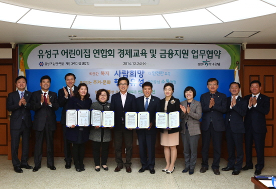 유성구 어린이집 연합회와 하나은행은 24일 유성구청 중회의실에서 지역사회 나눔과 상호 협력을 위한 협약을 체결했다. 이번 협약으로 하나은행은 어린이집 아이들에게 경제교육을 지원하는 한편, 금융지원을 실시할 예정이다.