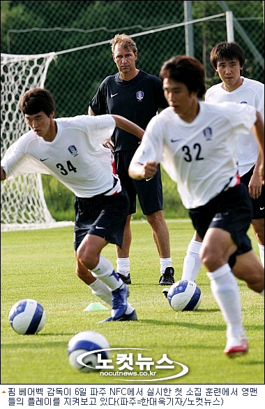 한국 축구대표팀의 신임 사령탑에 오른 핌 베어벡 감독이 대표팀의 첫 훈련을