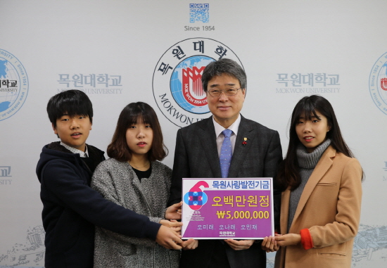 목원대(총장 박노권)는 8일 오전 총장실을 방문한 오미래(93년생), 오나래(95년생), 오민재(01년생) 삼남매로부터 발전기금 5백만원을 전달받았다.