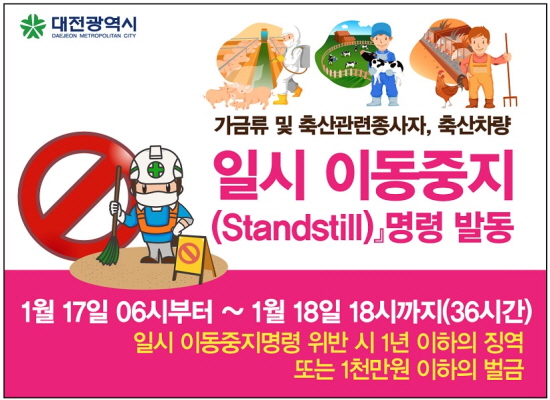 대전시는 농림축산식품부의 일시 이동중지(Standstill) 명령에 따라 17일(토) 아침 6시부터 18일(일) 오후 6시까지 36시간동안 관내 닭᛫오리 등 가금류 관련 축산인, 축산시설, 차량에 대해 일시 이동중지 명령을 발동한다고 15일 밝혔다.
