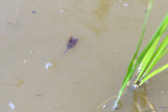 김중호씨는 “뜬모를 하려고 논에 들어갔다가 처음 보는 생물이 있어 생태전문가들에 문의해보니 긴꼬리투구새우라는 것을 확인했다”며 “이 논에서 친환경으로 농사를 지은지 7년이 됐는데 처음 보는 생물이라 무척 신기했다”고 말했다.