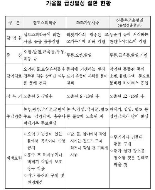 추수기에 많이 발생하는 가을철 열성질환은 갑작스런 고열을 동반한 감기몸살 증세를 보이며, 특히 야외 활동이 많은 사람에게서 주로 발생한다.