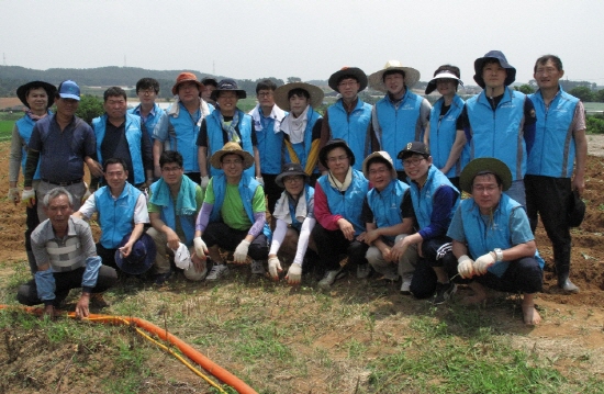 충남본부 및 서산•태안지사 농어촌사랑 봉사단 20여명은 이날 40여만의 가뭄으로 파종이 늦어진남산리 백익흠씨 소유 고구마 밭에서 모종 심기에 구슬땀을 흘렸다.