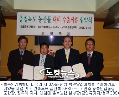 충북인삼농협(조합장 최만수)은 31일(한국시각) 미국 LA에서 정우택 지사가 참석한 가운데 미국의 한인 무역업체인 KHB 회사(대표 김천복)와 충북지역에서 생산하는 인삼 100만 달러 어치를 수출하기로 계약을 체결했다.