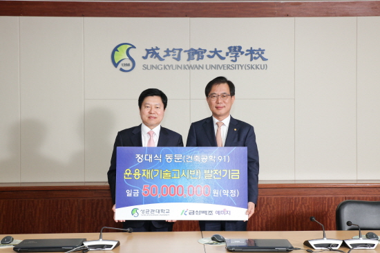 (주)금성백조주택 정대식 부사장이 26일 모교 성균관대학교를 찾아 기술고시반인 운용재 발전기금으로 5천만 원을 유지범 부총장에게 전달했다.
