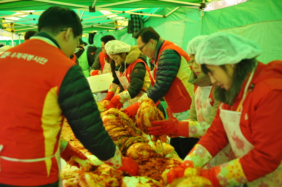 충청지방우정청이 27일 어려운 이웃에게 훈훈한 마음을 전하기 위해 우정청 직원 20여명이 둔산종합사회복지관, 지역기관 및 단체, 자원봉사자등 400여명과 함께 ‘사랑의 김장나누기 행사’를 가졌다고 밝혔다.
