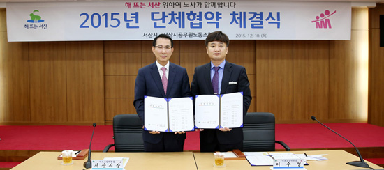 충남 서산시가 서산시청공무원노동조합(위원장 이수영, 이하 서공노)과 지난 10일 시청 중회의실에서‘2015년도 제1차 노사 단체 협약식’을 열어 총 10장, 91개 조항, 3개 부칙 단체협약서에 최종 공동 서명했다.