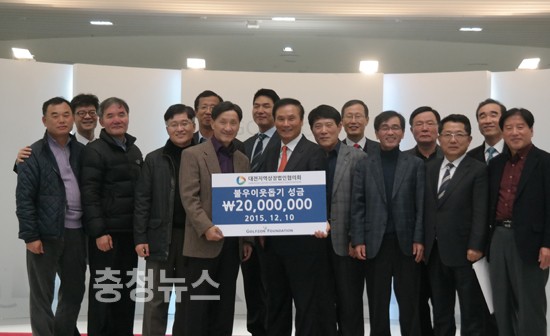 (재)골프존문화재단(이사장 김영찬)은 대전지역상장법인협의회(회장 이익우)로부터 2천만원의 불우이웃돕기 성금을 기부받았다고 14일 밝혔다. 총 24명개 대전지역상장법인협의회 회원사들은 지난주 10일 저녁 대전 유성구의 골프존 조이마루 1층 챔피언스홀에서 12월 정기모임을 갖고 연말을 맞이하여 불우이웃돕기 성금 전달식을 가졌다.