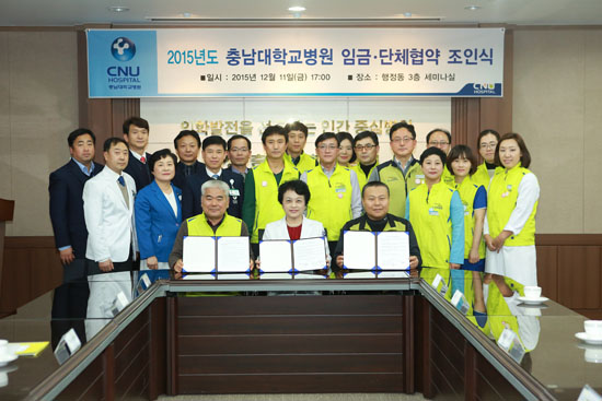 충남대학교병원(원장 김봉옥)가 11일 오후 행정동 3층 세미나실에서 노․사측 교섭위원들이 참석한 가운데 2015년도 임금단체협약 조인식을 개최했다.