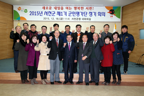 서천군 군민평가단(단장 한선교)이 2015년을 마무리하는 정기 회의를 18일 서천군청 대회의실에서 노박래 서천군수를 비롯한 군민평가단 의원 등 20여명이 참석한 가운데 개최했다.
