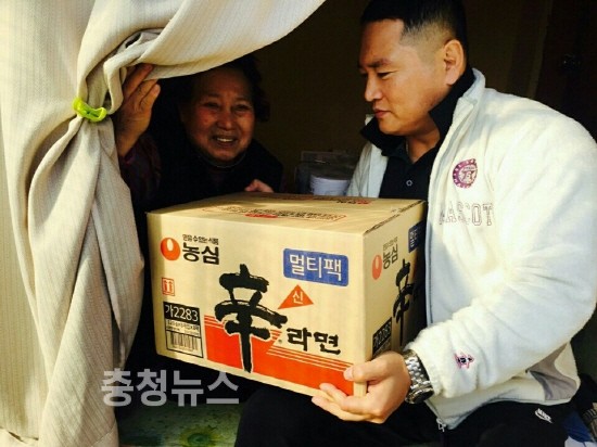 ▲ 이영찬 타이거짐 대표가 충남 아산시 탕정면 살고 계시는 독거노인들에게 물품 전달/충청뉴스 최형순기자
