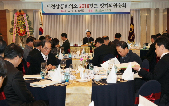 대전상공회의소(회장 박희원)가 23일 오전, 유성 아드리아호텔에서 상의 회장단을 비롯한 의원 60여명이 참석한 가운데 ‘2016년도 정기의원총회’를 개최했다.