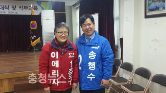 총선을 40일을 앞둔 4일 오전 대한노인회중구지회 대강당에서 열린 노인일자리사업 발대식 행사장에 참석한 더불어민주당 송행수 예비후보는 새누리당 이에리사 예비후보를 만나 과열경쟁을 지양하는 대신 정책대결로 승부하는 클린선거를 다짐했다.