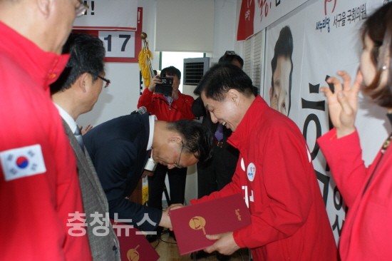 ▲ 이재선 서구을 후보, 선거대책본부 발대식에서 당내 경선 경쟁자였던 조성천 후보가 공동 선거대책위원장으로 위촉됐다.