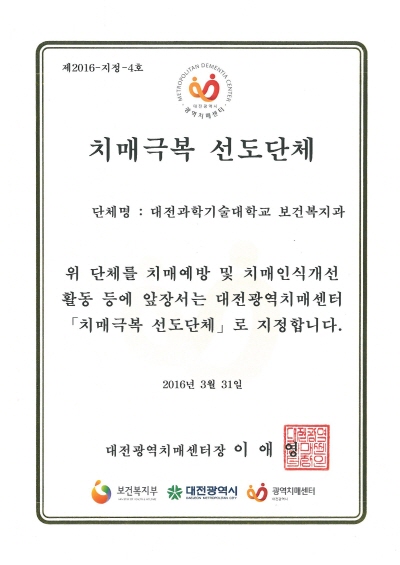 대전과학기술대학교 보건복지과가 2014년 6월 [대전광역시 광역치매센터와 대학생파트너 양성대학교 상호협력 협약식]을 시작으로 치매관리의 개발과 공익적 봉사에 있어 상호이해와 호혜의 원칙아래 지역사회 치매발생예방과 관리, 치매봉사 전문 인력의 교육과 훈련 등을 꾸준히 실시해 온 결과를 인정받아 지난 달 31일 대전광역치매센터로부터 치매극복 선도단체로 지정되었다.