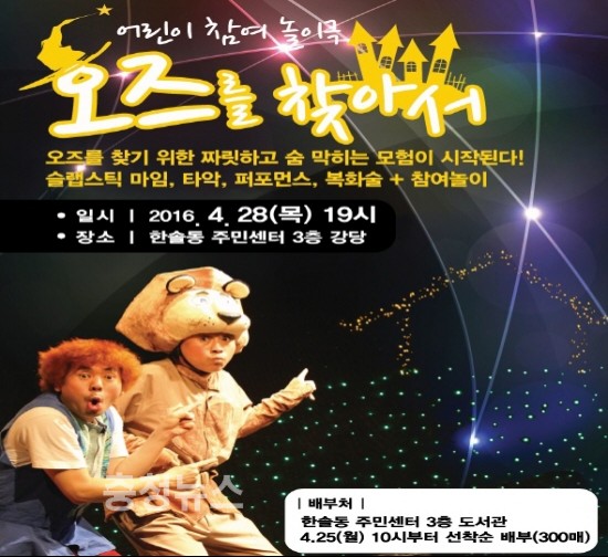 오후 7시부터 1시간 동안 한솔동 주민센터 3층 대강당에서 공연되는 어린이 참여 놀이극 ‘오즈를 찾아서’는 아이들 눈높이에 맞춰 복화술과 BOX 마임, 공기대포, 공놀이, 타악 등 다양한 공연이 펼쳐진다.