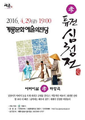 충남 계룡시(시장 최홍묵)는 5월 가정의 달을 맞아 29일 오후 7시 계룡문화예술의전당에서 마당극 ‘효(孝)’퓨전심청전을 공연한다.